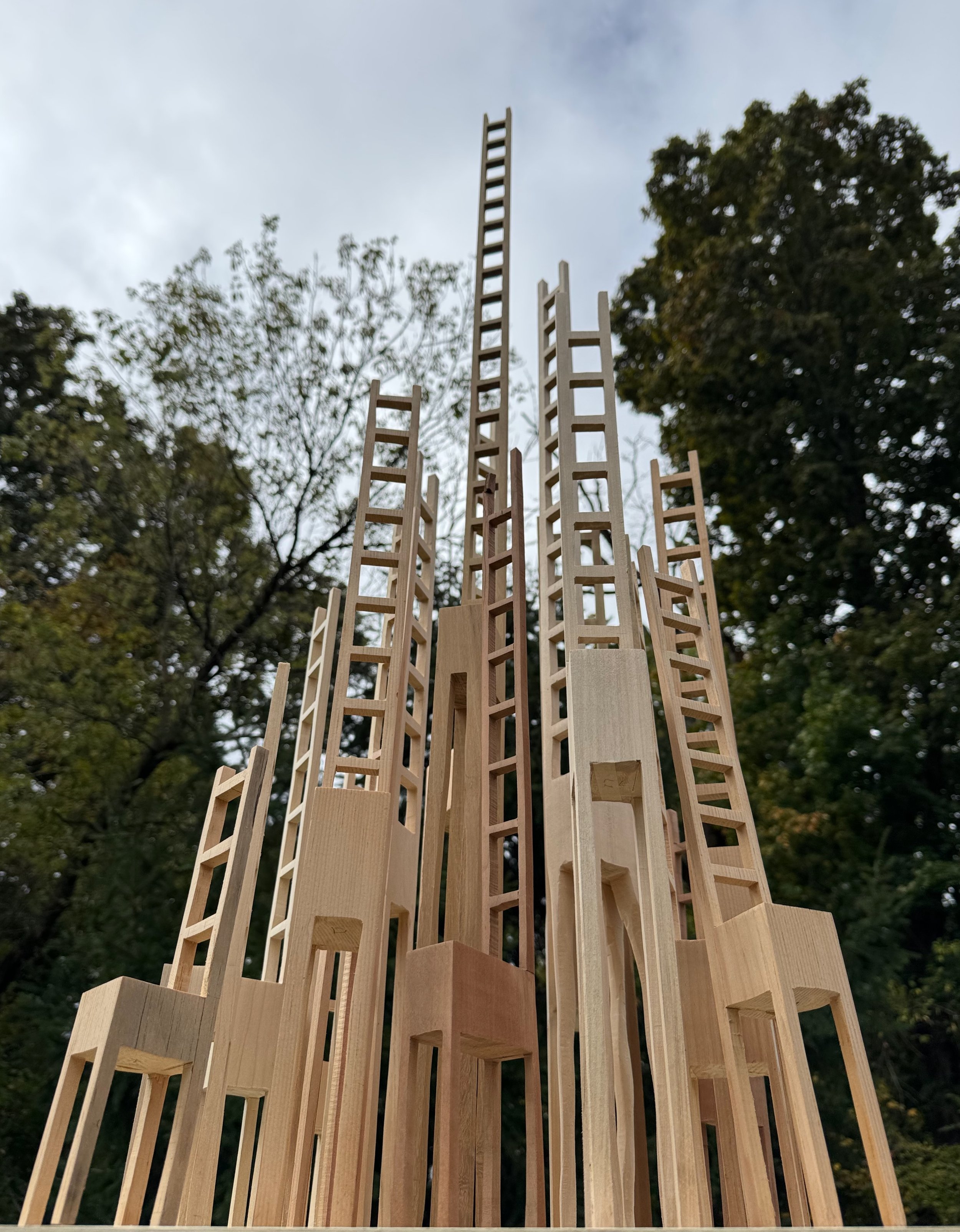 This experimental piece is a gathering of 21 individual chairladders of different sizes, heights, and woods. I installed each one to evoke a conversation with its neighbors, and as an overall group. Although silent, there is a dialogue within the negative space that is created amongst them.