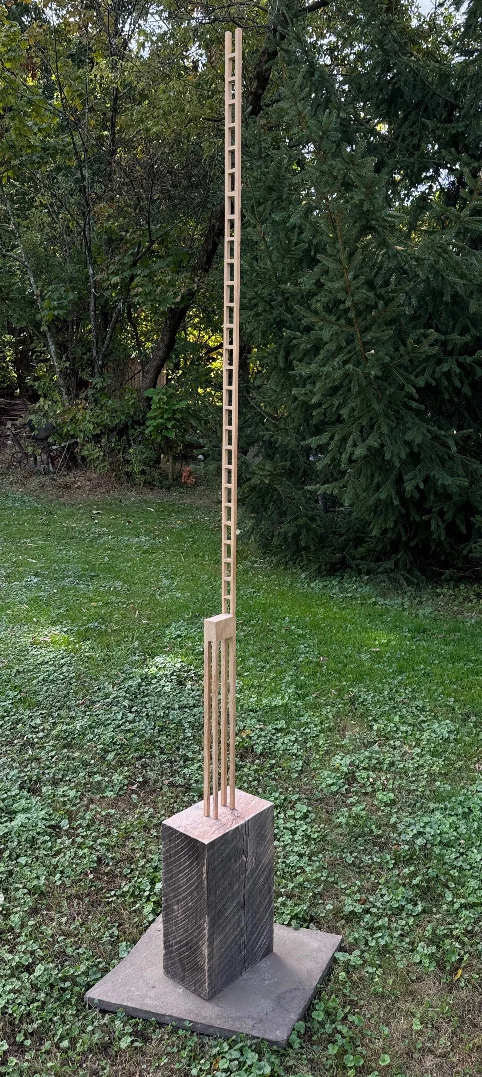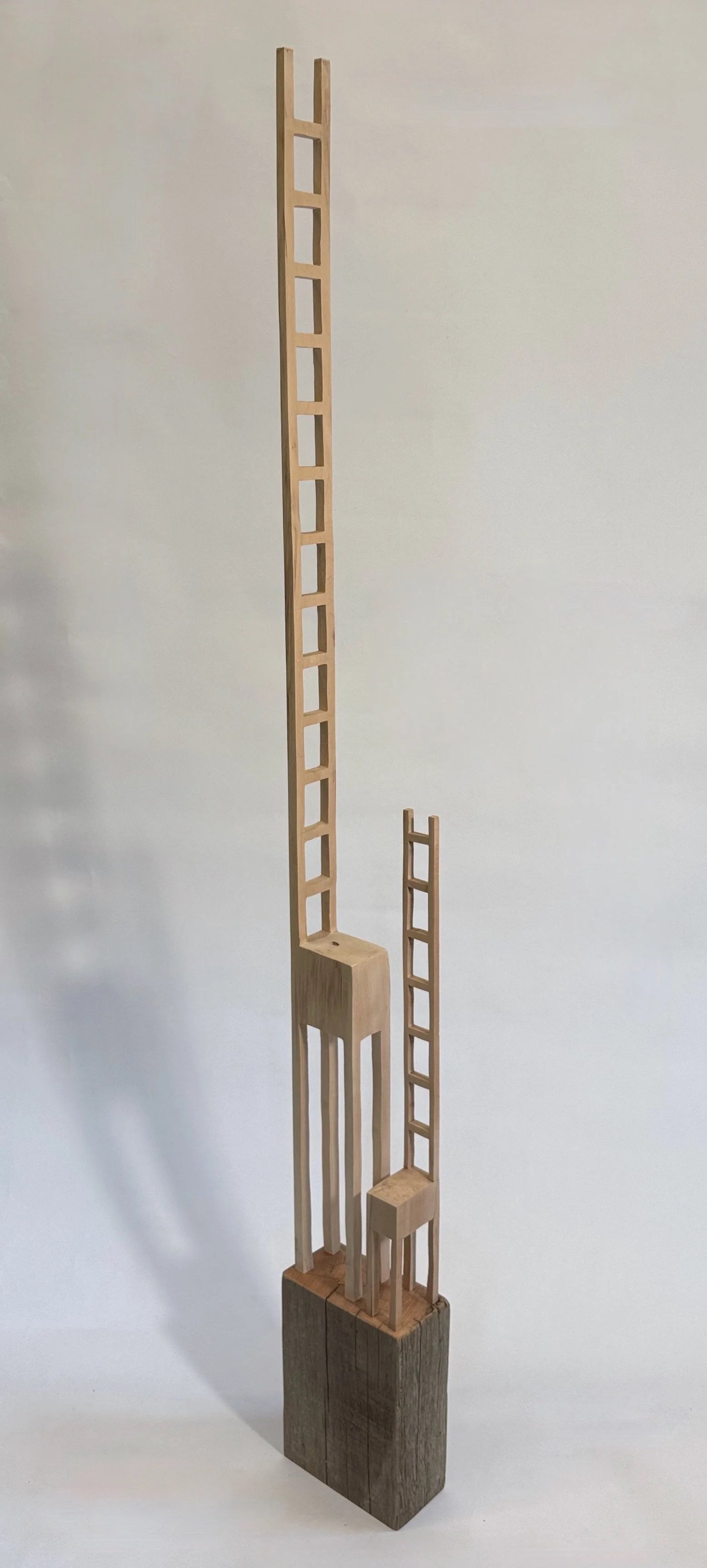Two Chairladders stand side by side and are poised to contemplate conversation. They are related from birth. The dark grey spot that appears in each “seat” is because the smaller one was carved from the negative space of the larger. Their base offers a ledge in hopes they might be stacked.