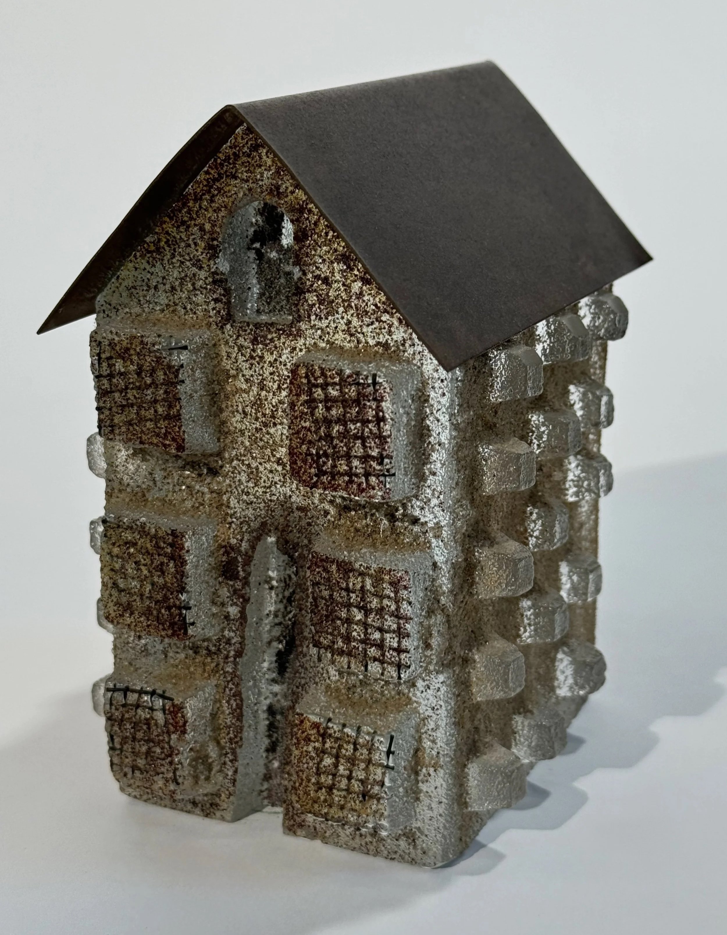 A collection of cast glass architectural forms made by setting colored glass powders into sand molds to produce colored surfaces. Often include mixed media, ranging from copper inclusions, steel plate bases, and carved wood building pedestals.